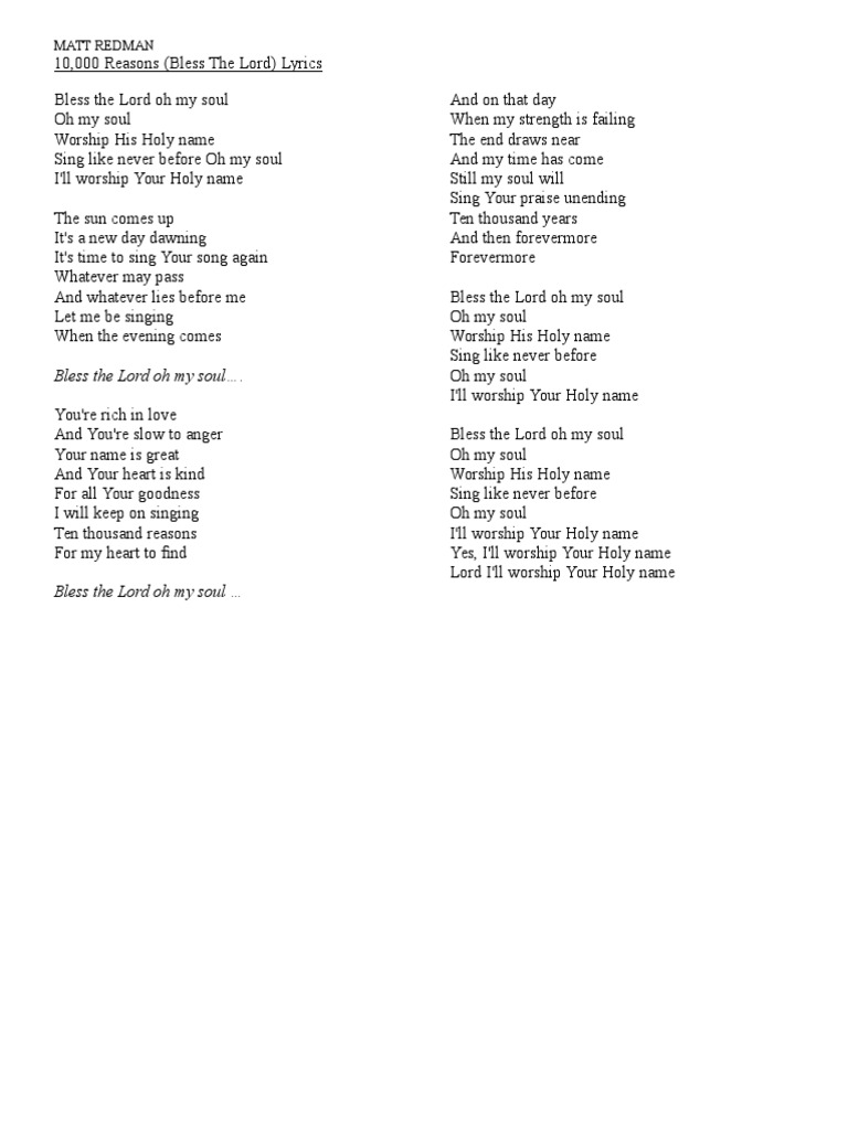Favorite (9 fans) matt redman. The sun comes up, it's a new day dawning it's time to sing your song again whatever may pass, and whatever lies before me let me be singing when the evening comes chorus bless the lord, o my soul o my soul worship his holy name sing. New singing lesson videos can make anyone a great singer bless the lord oh my soul oh my soul worship his holy name sing like never before oh my soul i'll worship your holy name the sun comes up it's a new day dawning it's time to sing your song again whatever may pass and whatever lies before me let me be singing when the evening comes bless the lord oh my soul oh my soul worship his. I'll worship your holy name. The lyrics for 10,000 reasons / what a beautiful name by caleb and kelsey have been translated into 4 languages. Free chords, lyrics, videos and other song resources for 10,000 reasons (bless the lord) by matt redman. I'm gonna love you (ooh) i'm gonna love you. Ooh, gotta cure my curiosity. C g d c g c g bless the lord, o my soul d/f# em o my soul c g dsus worship his holy name d c em sing like never before. Passion conferences , sparrow records. The sun comes up, it's a new day dawning it's time to sing your song again whatever may pass and whatever lies before me. Matt redman (born 14 february 1974) is an english christian worship leader, songwriter and author based in brighton, east sussex, united kingdom. Enjoy the videos and music you love, upload original content, and share it all with friends, family, and the world on youtube.