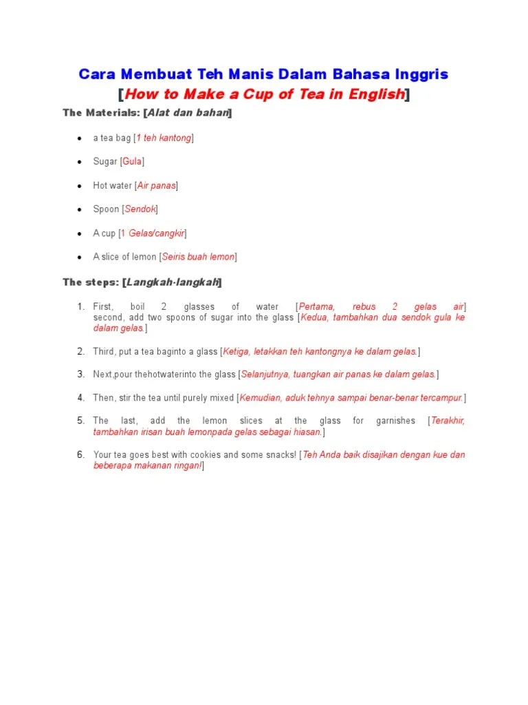Cara Membuat Teh Menggunakan Bahasa Inggris : Contoh Procedure Text How To Make A Cup Of Tea Kata Kata Bijak Bahasa Inggris Dan Artinya : · giling dan sobek beberapa daun .. Cara membuat teh panas dalam bahasa inggris: how to make a cup of tea in english. Terjemahan frasa bisa membuat teh dari bahasa indonesia ke bahasa inggris dan contoh penggunaan bisa membuat teh dalam kalimat dengan terjemahannya: · giling dan sobek beberapa daun . A tea bag 1 teh kantong.