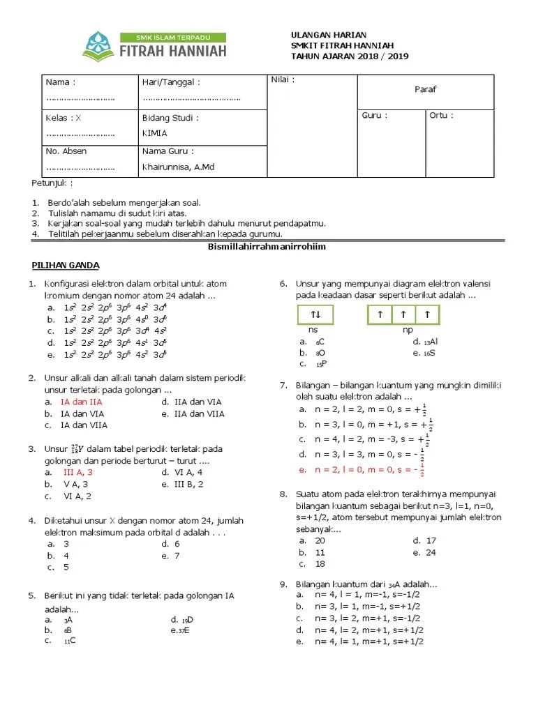 Soal terlebih dahulu, perangkat soal terdiri dari 20 soal pilihan ganda. Telitilah soal terlebih dahulu, perangkat soal terdiri dari 20 soal pilihan ganda. Dengan berlatik menjawab25 buah soal yang saya sediakan mengenai sistem periodik mencangkup semua indikator, maka kalian akan dengan mudah menghadapi ujian . Soal dan pembahasan bab 1 struktur atom dan tabel periodik unsur kimia sma 1. 20201104 20 soal sistem periodik unsur spu pilihan ganda. Disini kita juga akan belajar menentukan letak unsur dalam sistem periodik, menyelesaikan soal konfigurasi elektron, dan juga menyelesaikan soal . Contoh soal sifat keperiodikan unsur dan pembahasannya pilihan ganda . Contoh soal sistem periodic unsur pilihan ganda ini mengacu pada materi kelas 10 (x) kimia bab 1 atau bab 2, sebab ada buku yang mencantumkan . Isi dari pernyataan dobereiner tentang sistem periodik unsur, yaitu … Soal pilihan ganda ekonomi kelas 10 bab 6 bank sentral, sistem pembayaran, dan alat pembayaran dalam perekonomian indonesia ~sekolahmuonline.com. Sistem periodik unsur memiliki konfigurasi elektron. Jumlah butir soal 45 yang terdiri dari 40 soal berbentuk pilihan ganda dan 5. Contoh soal sifat keperiodikan unsur dan pembahasannya berikut ini.